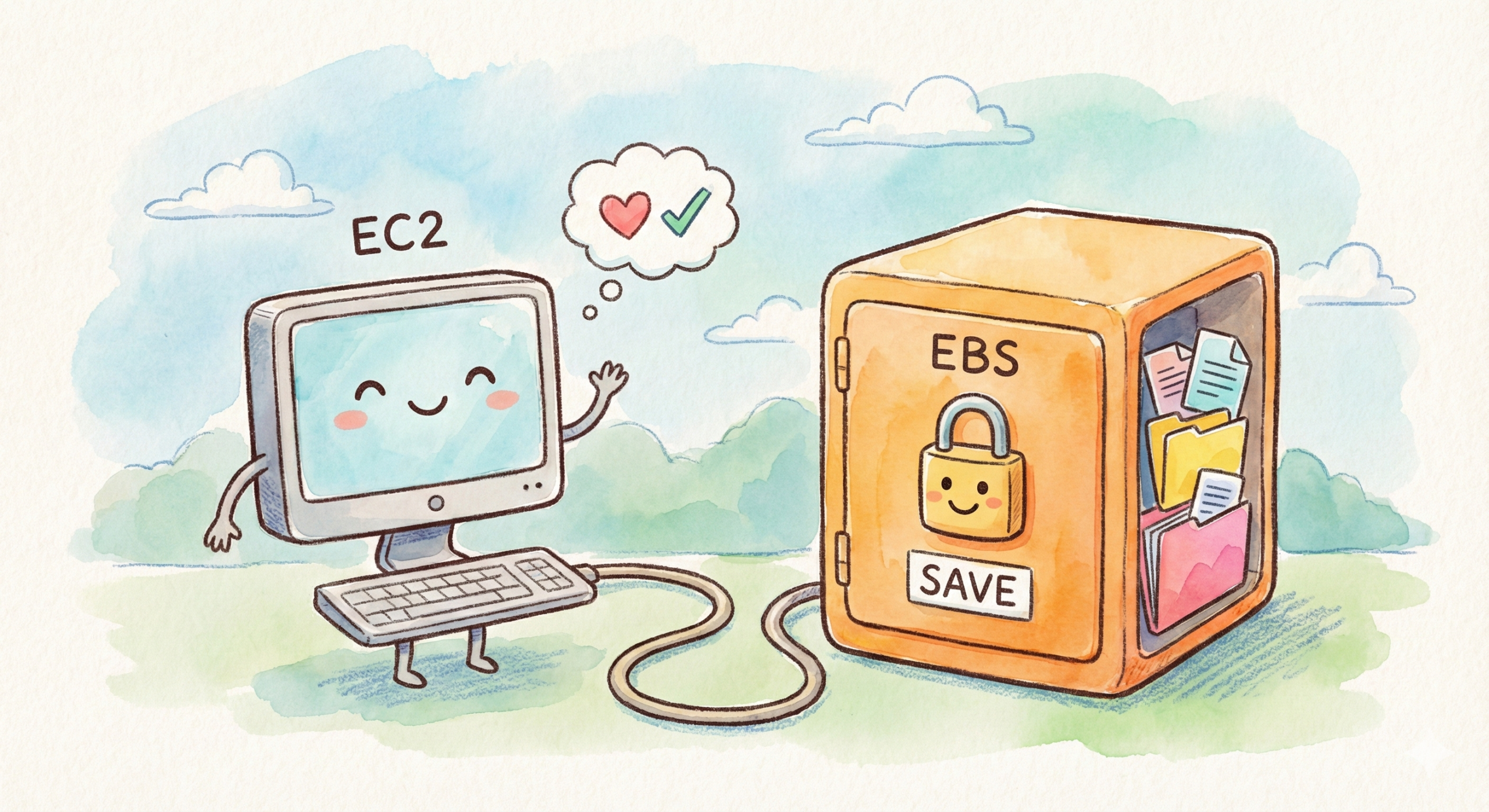 このEBSがあるおかげで、私たちはクラウド上でも、家のパソコンと同じように「保存」ボタンを押して安心して眠ることができるんですよ。