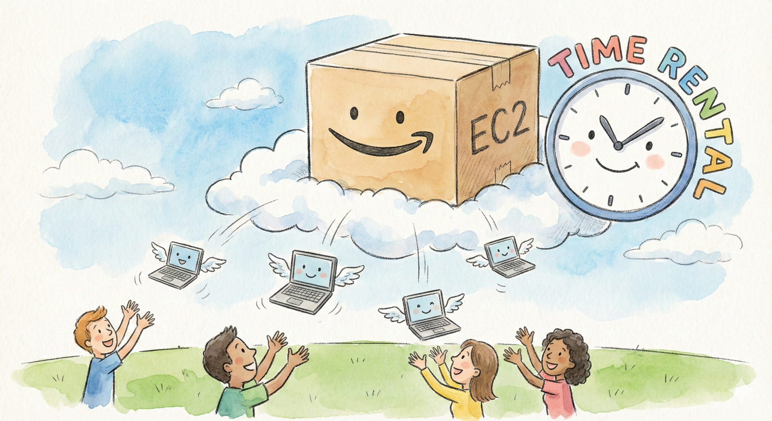 Amazon EC2(イーシーツー)は、そんな面倒なことを全部Amazonにお任せして、「使いたい時だけ、Amazonの倉庫にあるパソコンをネット経由で遠隔操作させてもらう」というサービスなんです。