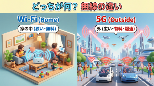 【ざっくり言うと】どっちも「無線でネットに繋ぐ技術」やけど、得意なエリアと料金の仕組みが違うんや。 Wi-Fi(ワイファイ): 家の中専用。エリアは狭いけど、基本使い放題(無料)。 5G(ファイブジー): 外でもどこでも繋がる。エリアは広い...